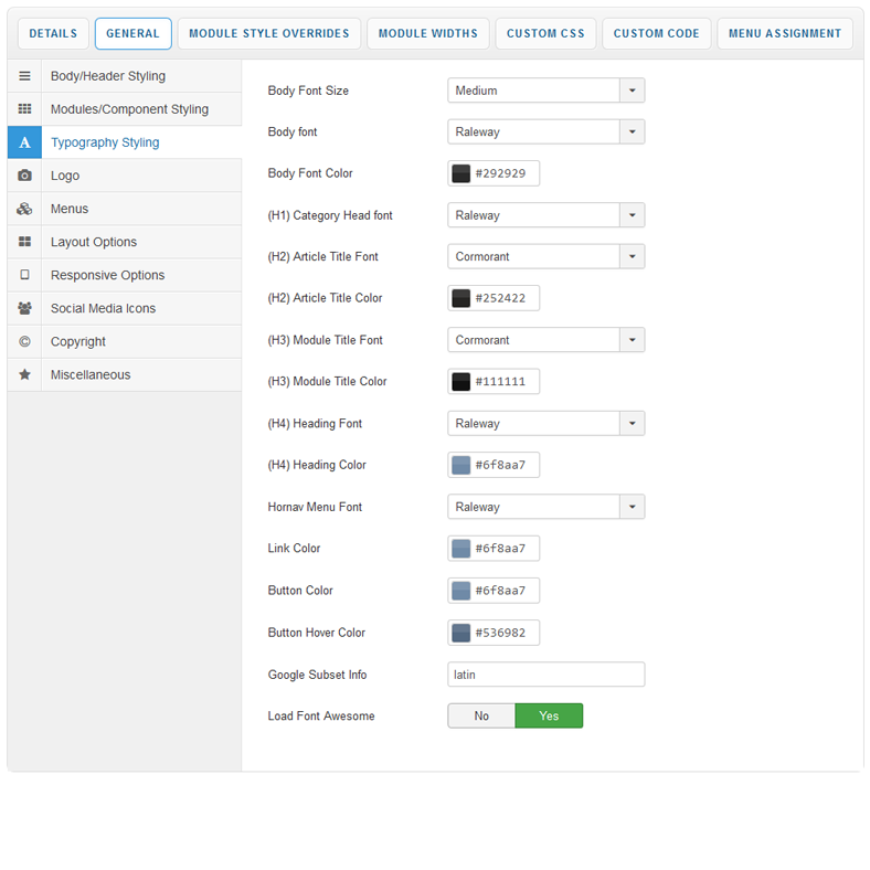 Here you will find some of the main Color Choosers for your template allowing you to control the colour of the main elements of your template including background images and colors, top menu, module positions etc. Other features in this section include font changers allowing to you to choose from 14 websafe fonts and over a 100 Google fonts for a number of different elements of your template including the body, article title and module title fonts. Also included is color choosers to set the article title, module title, content link and buttons to your own taste.