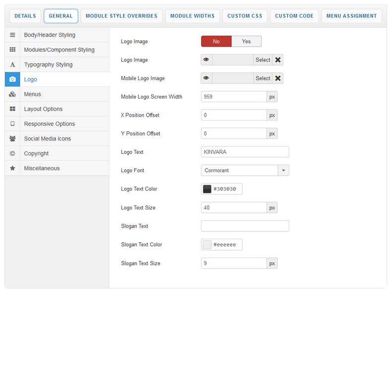 This section of the template parameters allows full control over your site logo with an array of easy to use options. Upload your logo image via the 'Select Logo Image' field and then use the X and Y axis field to tweak its position.