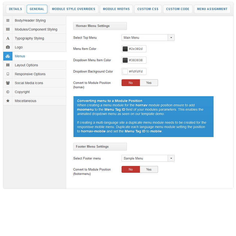 Some of the main menus of the template are now set via the template parameters saving you having to set up menu modules for each menu. From this section you can choose what menus you would like connected with these pre assigned menu areas of the template.