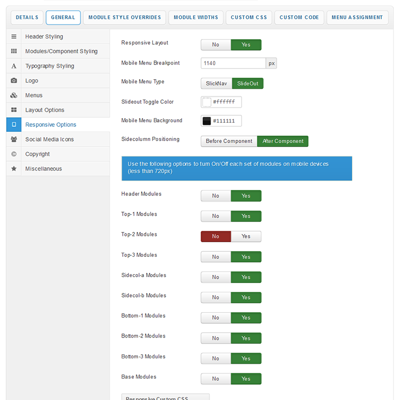 Module Style Overrides allow you to style individual module positions to your own taste. This greatly extends the control of how each of your module positions are displayed with a host of styling options including background image, background color, text color, heading color, button color and module padding. Multiple overrides can be created, each applied to the module position of your choice.
